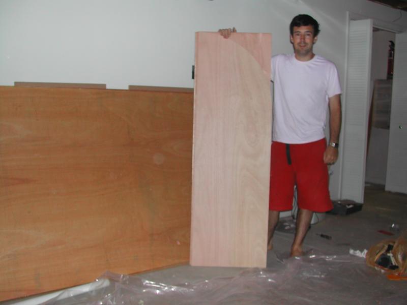The daggerboard is 5'3" x 20", laminated out of 4 layers of 1/4" plywood. Here I'm holding the stack of blanks, one of which has been cut to final shape.