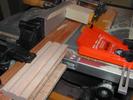 ![]() Birdsmouth jig I made a jig for holding the staves tightly while they go through the tablesaw. I clamped a piece of scrap oak flooring to the fence, and then clamped top & bottom guides to it. This lets me get a perfect 45 degree slot in the staves. |
