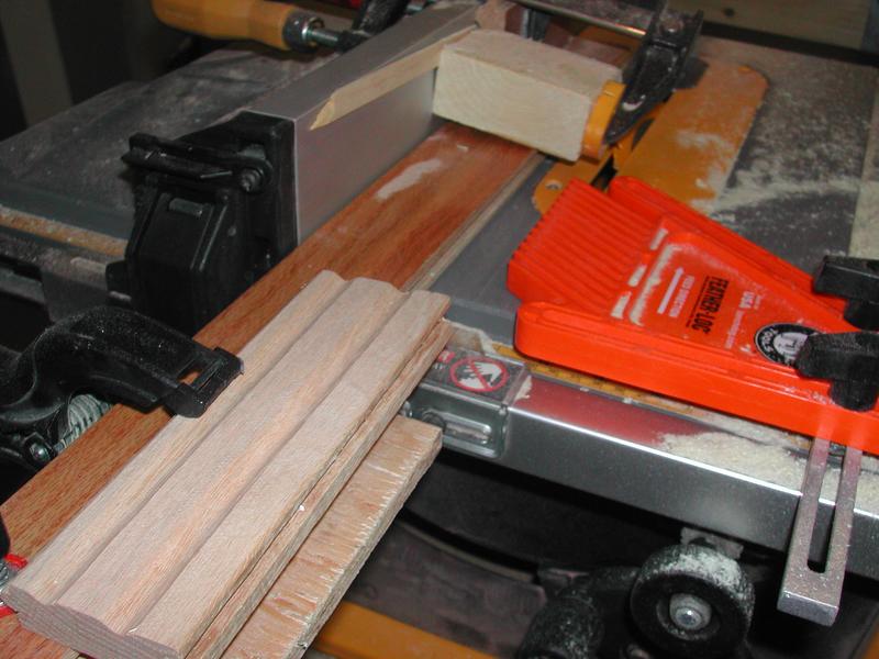 I made a jig for holding the staves tightly while they go through the tablesaw. I clamped a piece of scrap oak flooring to the fence, and then clamped top & bottom guides to it. This lets me get a perfect 45 degree slot in the staves.