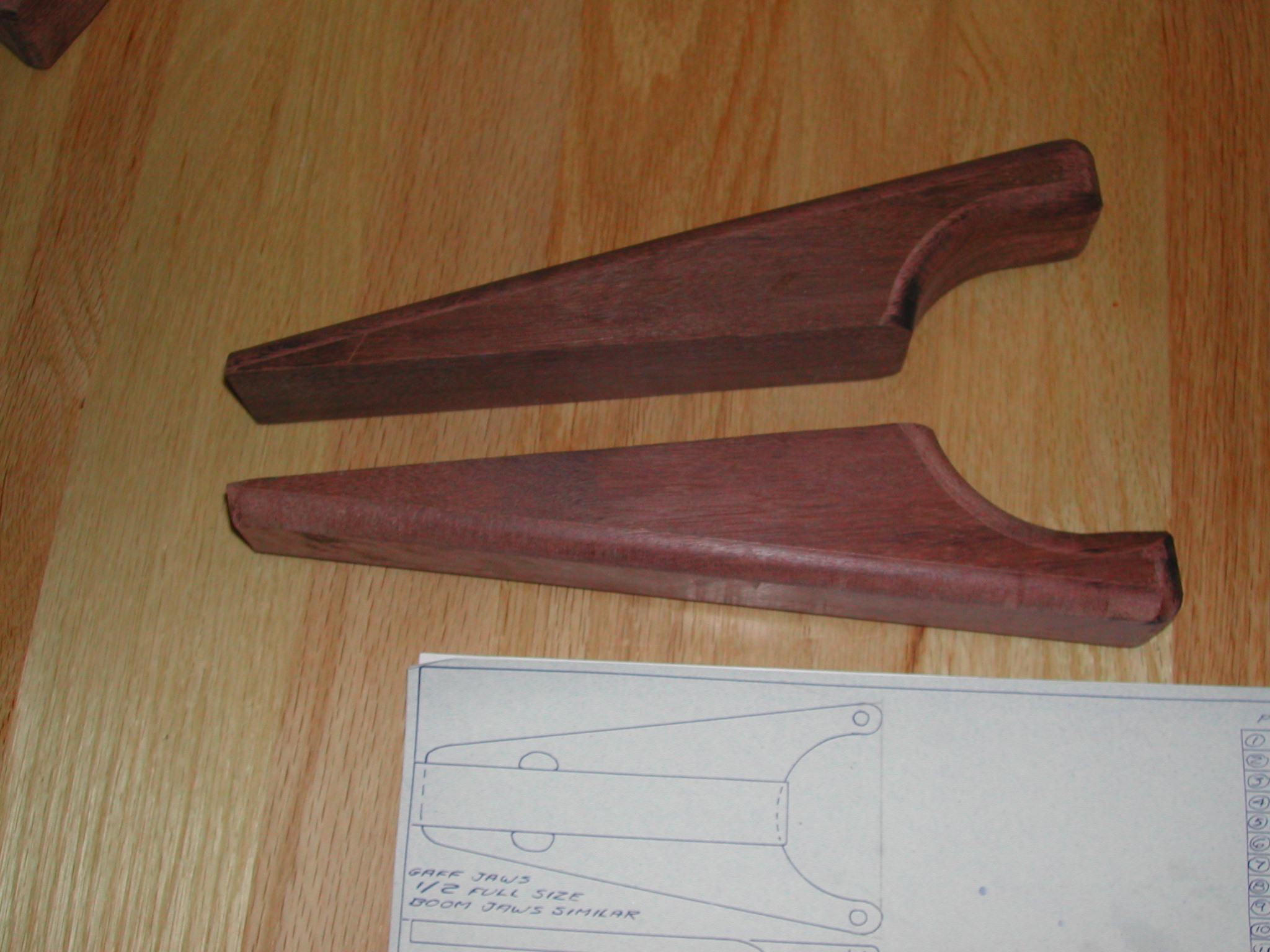 The plans show half-scale gaff jaws, and say "Boom Jaws similar". Well, similar is NOT identical, as I learned when my first attempt failed. The problem is that the gaff is 1.5" wide, while the boom is only 3/4". So, by making the jaws identical, I ended up with jaws that wer 3/4" undersized. This left too little material, and I had to start over. This is my second attempt, using 8/4 mahogany -- double the thickness specified in the plans. These are MUCH sturdier than the 3/4" doug fir from my first attempt.